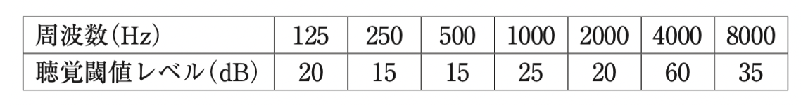 平均聴力レベル = (15 + 25 + 20)/3=20(dB)