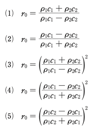 密度ρ1、音速c1の媒質1と密度ρ2、音速c2の媒質2が接続しているとき、2つの媒質の境界面に垂直入射する音の強さの反射率r0を示す式はどれか。