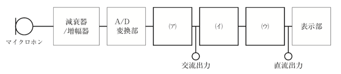 下図は,ディジタル表示の一般的な騒音計の構成を示したものである。(ア)~(ウ)の中に挿入すべき語句の組合せとして、正しいものはどれか。