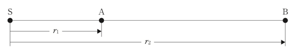 地点Aを基準点、地点Bを測定点とすると、幾何減衰は以下のようになります。