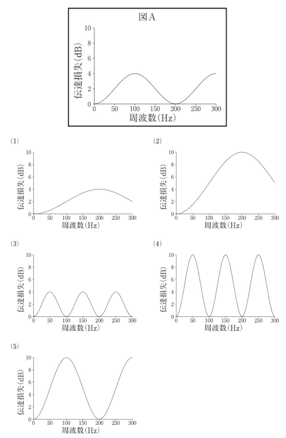 伝達損失が図Aで表される膨張形消音器がある。この消音器の膨張比は変えずに、空洞の長さを2倍にした場合の伝達損失の周波数特性として、正しいものはどれか。