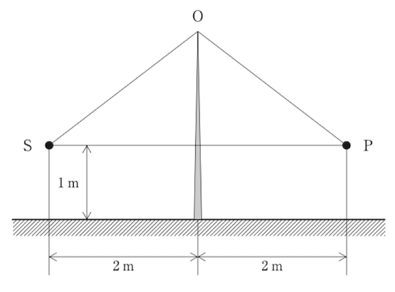 工場内の機械に、周波数1020Hzの純音性の騒音を発する全指向性点音源Sがある。点音源Sと測定点Pとの間には、下図のように高さ2.5mの塀(地表面から頂点Oまでの高さ)が設置されている。測定点Pでの騒音レベルを低減する必要が生じたことから、塀の高さを5mに変更することを計画している。この変更により、騒音レベルは約何 dB低減するか。ただし、施設塀の長さは十分に長く、また塀からの透過音及び地表面での反射音は無視できるものとする。音速を340m/s,√5=2.24として計算せよ。